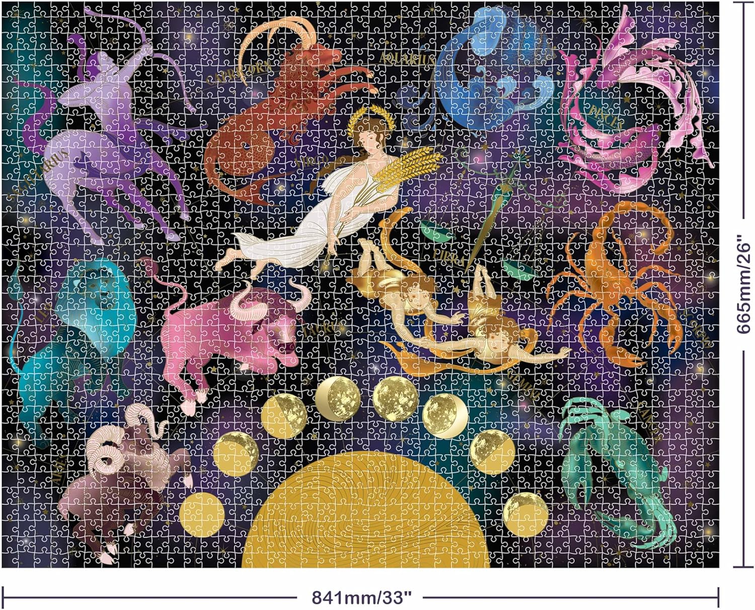 Journey through the cosmos as you piece together the twelve signs of the zodiac in this stunning Zodiac Signs Mindbogglers Gold 1500-Piece Jigsaw.