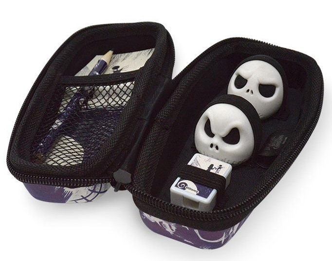 A zipped Mini Stationery Case which contains a mini pencil, mini notepad, two 3D Jack Skellington head shaped erasers and a pencil sharpener.