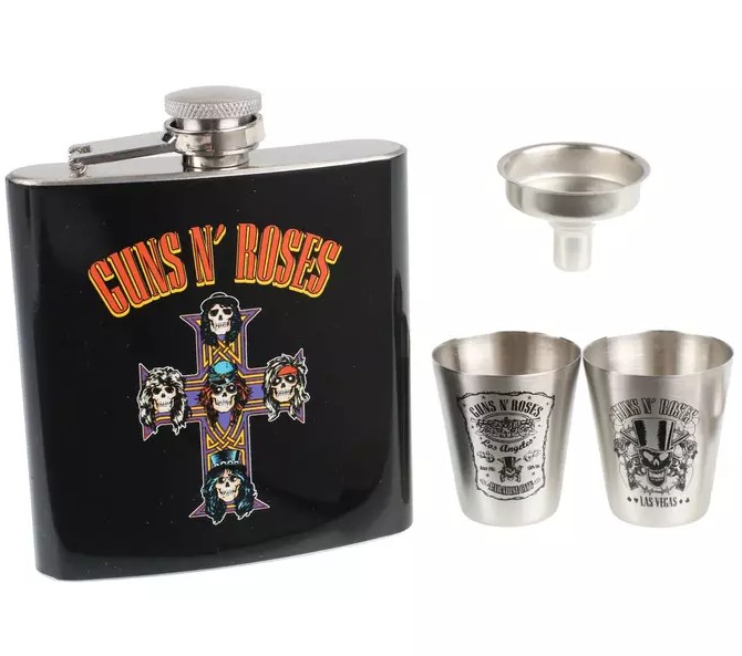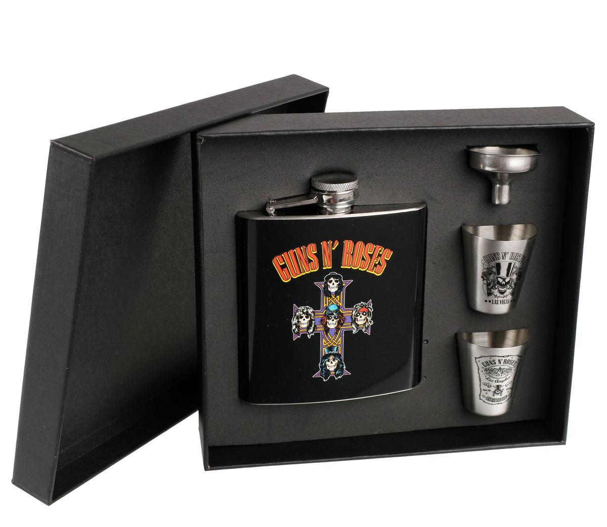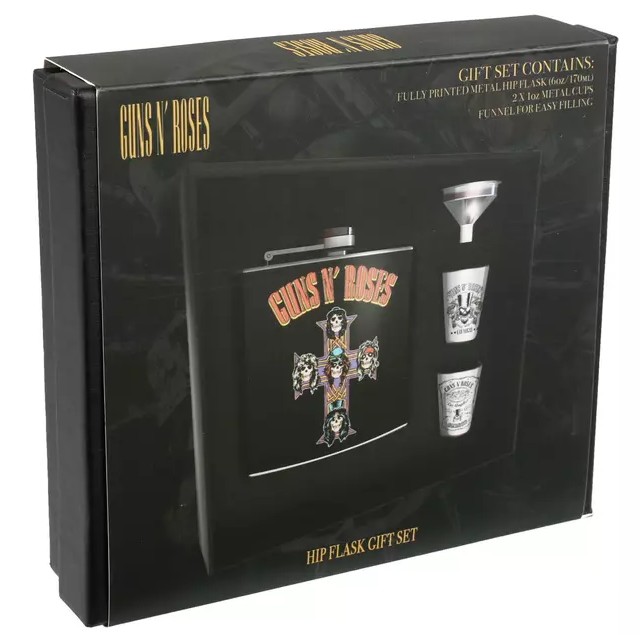 Perfect for Guns N’Roses music fans our official Hip Flask Set contains a fully printed Guns N’ Roses decorated metal hipflask with a 170ml capacity, a funnel for easy refilling and two metal cups to ensure you get the perfect measure.