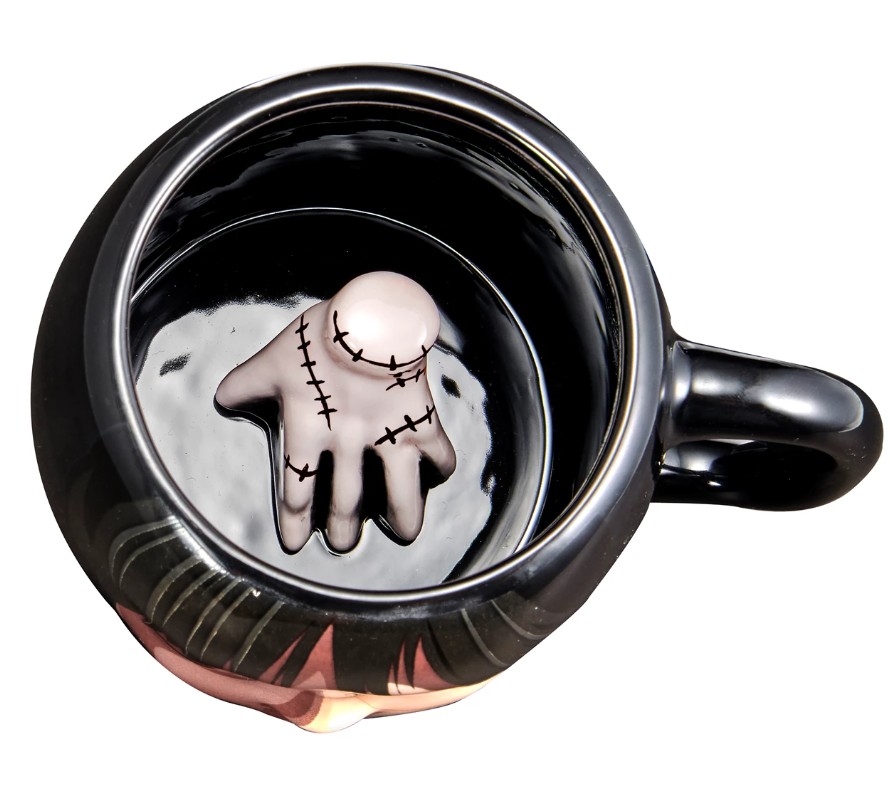 Horribly wonderful and perfect for gifting is this crafted Wednesday 3D mug with a hidden surprise Thing inside, complete with blood curdling stitching and scars!