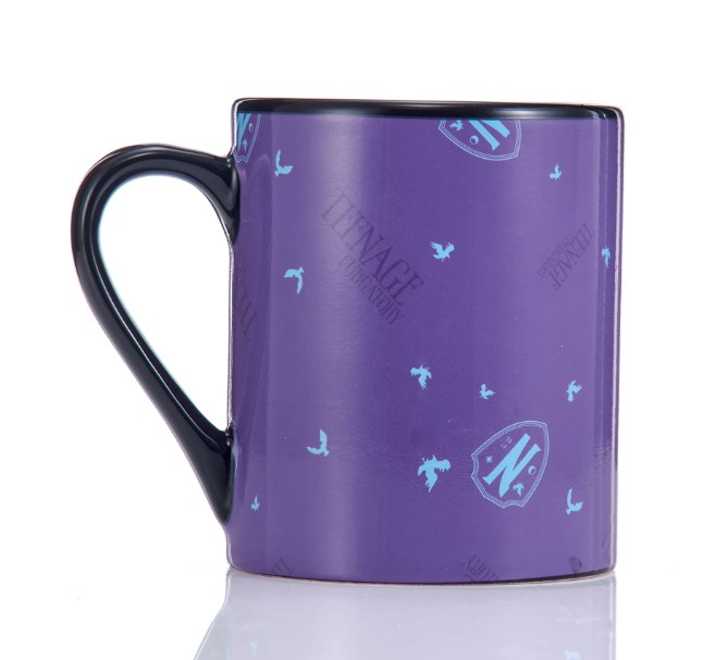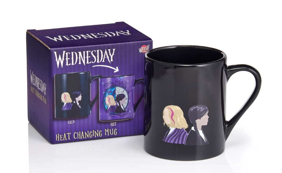 The perfectly horrible mug for friends of the Netflix series Wednesday, featuring fan favourites Wednesday & Enid – Add your favourite hot drink and watch the black mug come to life.