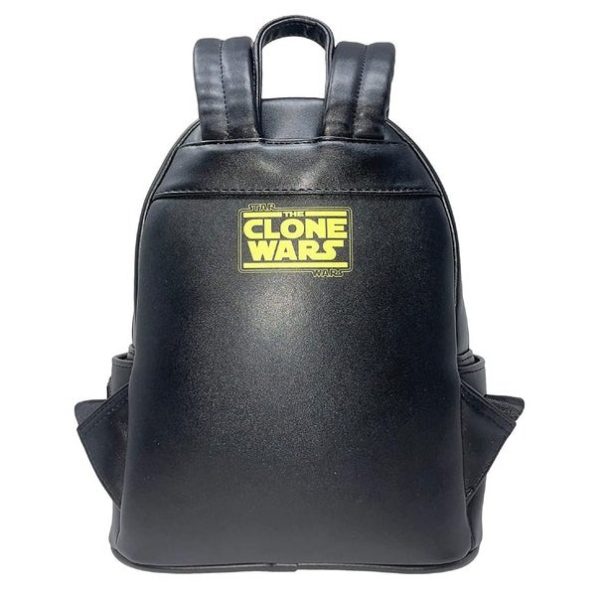 - Also features Loungefly x Star Wars metal badge detail on side, Clone Trooper enamel zip, Clone Wars logo printed on the back, and an interior lining with matching themed fabric.